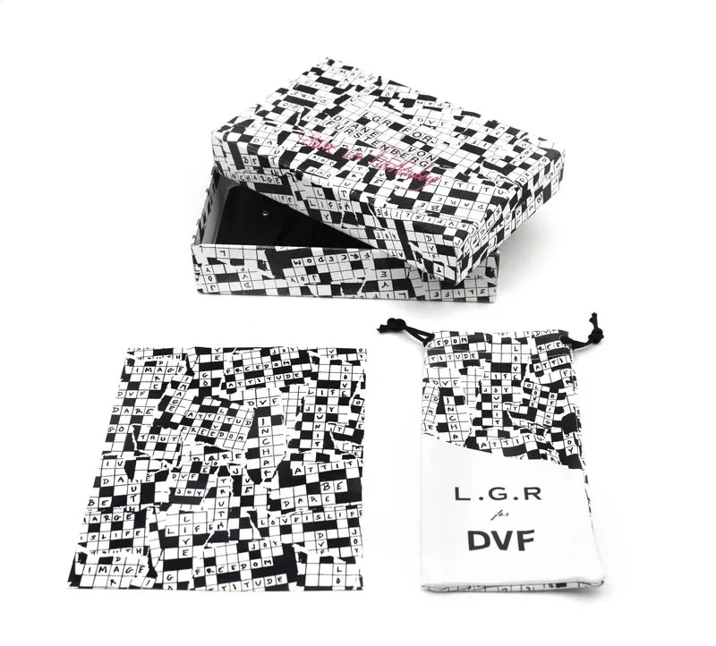Each features gold engravings on the inner temples of the L.G.R for DVF collaboration logo and the celebratory hashtag #Wrap50.